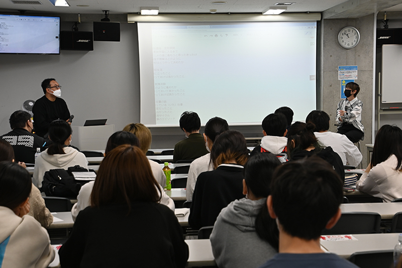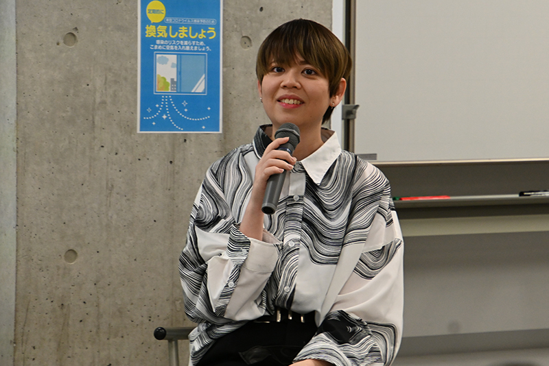講義では、台湾からの留学生として入学した東放学園在学中の授業や就職活動の話から、サンジゲンでモデラ―としてさまざまな作品に携わってきた3年間を振り返りながら、仕事の流れや制作現場の様子、モデラ―に求められるスキルなどいろんな話をしてくれました。