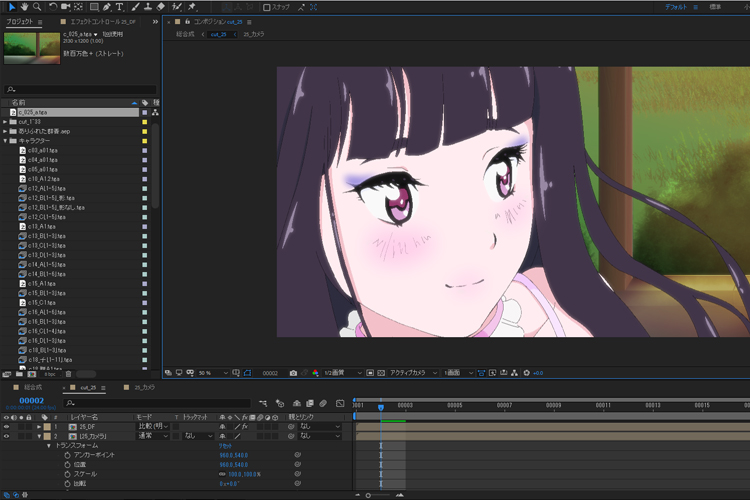 「Adobe After Effects」を使ってキャラクターと背景を合成し、画面をかっこよく見せるエフェクトをかけたアニメ映像を制作します。