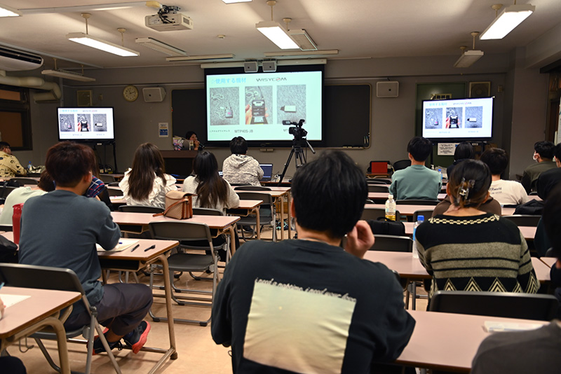 授業では、ドラマ撮影や情報番組のロケ取材といった現場での仕事内容や1日のスケジュール、普段使用している機材について解説。加藤さんが音声助手として携わった『記憶捜査3~新宿東署事件ファイル~』(テレビ東京系)や『商店街のピアニスト』(BS松竹東急)の撮影、また、今までで最も過酷な撮影だったという『Nスタ』(TBS系)の取材について、具体的なエピソードを交えて話してくれました。
