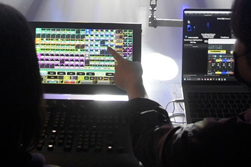 当日は、鶴崎さんが用意した照明プランに沿って、プロのデモンストレーションを見学。その後、参加者一人ひとりが実際に照明操作を体験し、音楽に合わせたライティングに挑戦しました。さらに、照明の仕事に興味を持ったきっかけや仕事のやりがい、照明スタッフの働き方など、参加者の質問にも答えていただきました。