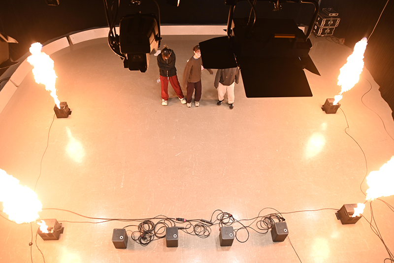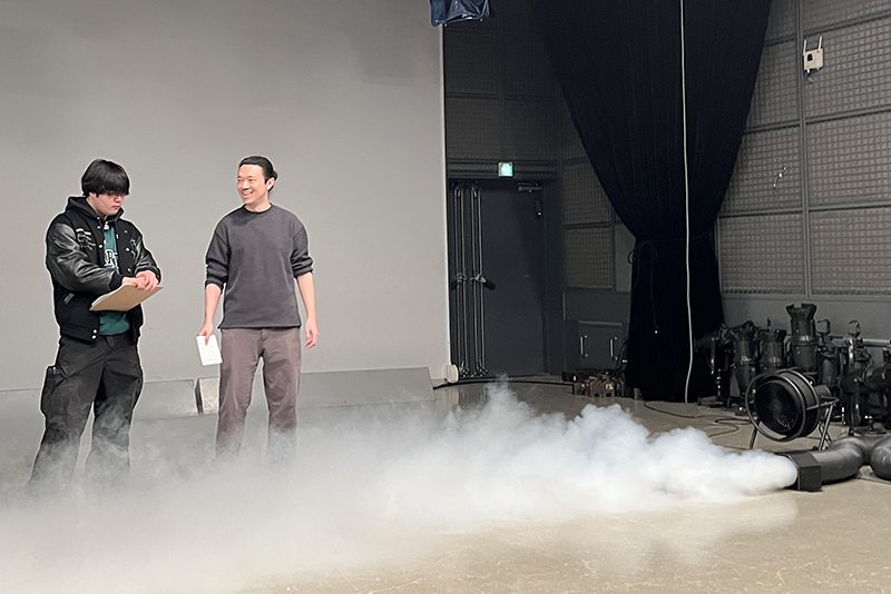 授業では、機材の安全な扱い方や配線を学び、学内スタジオで仕込みとオペレーションを体験。グループごとに曲に合わせて、紙吹雪やスモークのほか、火薬を使わず火花のような効果を生み出す機材も操作しました。