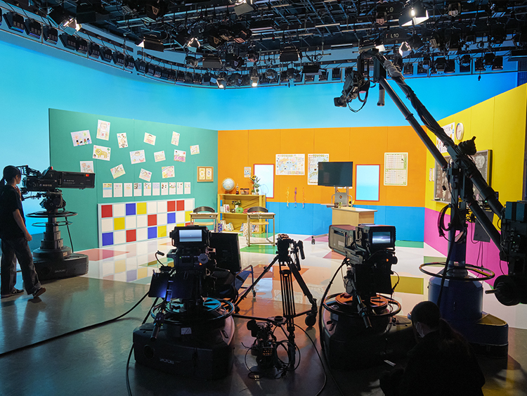 5学科合同で行うテレビ番組制作の実習でセットを立て込むスタジオを見学します。本格的な設備や番組収録の様子を体感してください!
