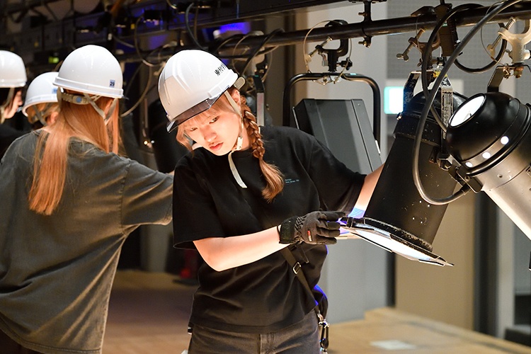 ステージやスタジオ上部に設置されている照明機材が、どのように取りつけられ点灯しているのかを実際に体験できます。在校生と一緒に作業しながら、プロの照明スタッフが行う現場の仕事を知ることができます。